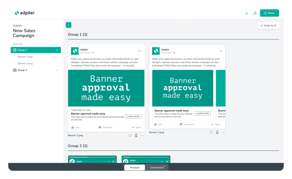 Experience the simplicity and efficiency of Adpiler with our free tool. Create and share social media mockups in seconds. Discover a hassle-free way to collaborate and get feedback on your mockups – all at no cost.